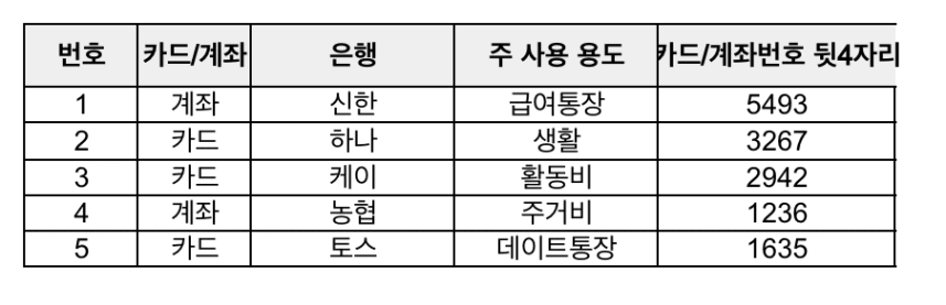 :흰색_확인_표시: (중요) 따로 계좌/카드 개설 및 없애지 마시고 기존에 있는 것을 리스트업만 해주세요!