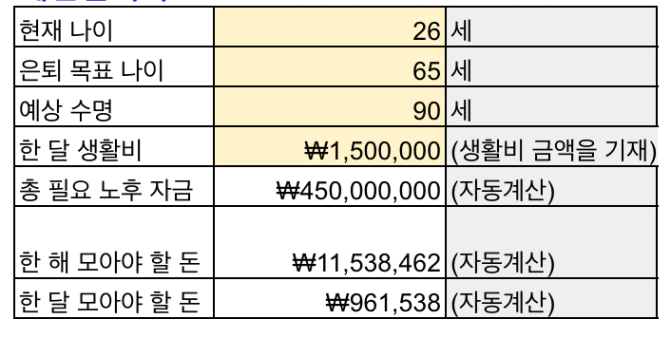 B. 한 해 모아야 할 돈: A. 총 필요 노후 자금 ÷ (2. 은퇴 목표 나이 - 1. 현재 나이)