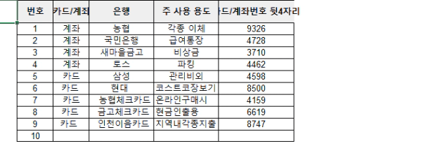 (중요) 따로 계좌/카드 개설 및 없애지 마시고 기존에 있는 것을 리스트업만 해주세요!