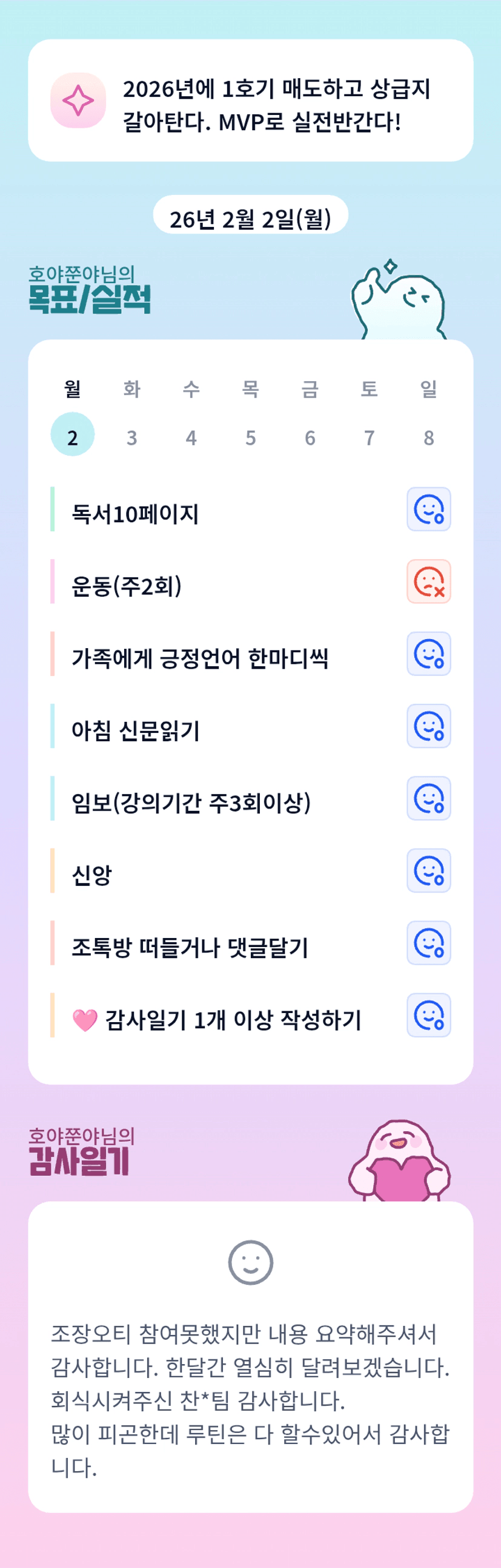 회사 회식 후 루틴 다 이루어내시고, 어제도 고생 많으셨어요! 호야님~ 앞으로 한 달 함께 즐검게 성장해보아요! 팟팅입니다♡