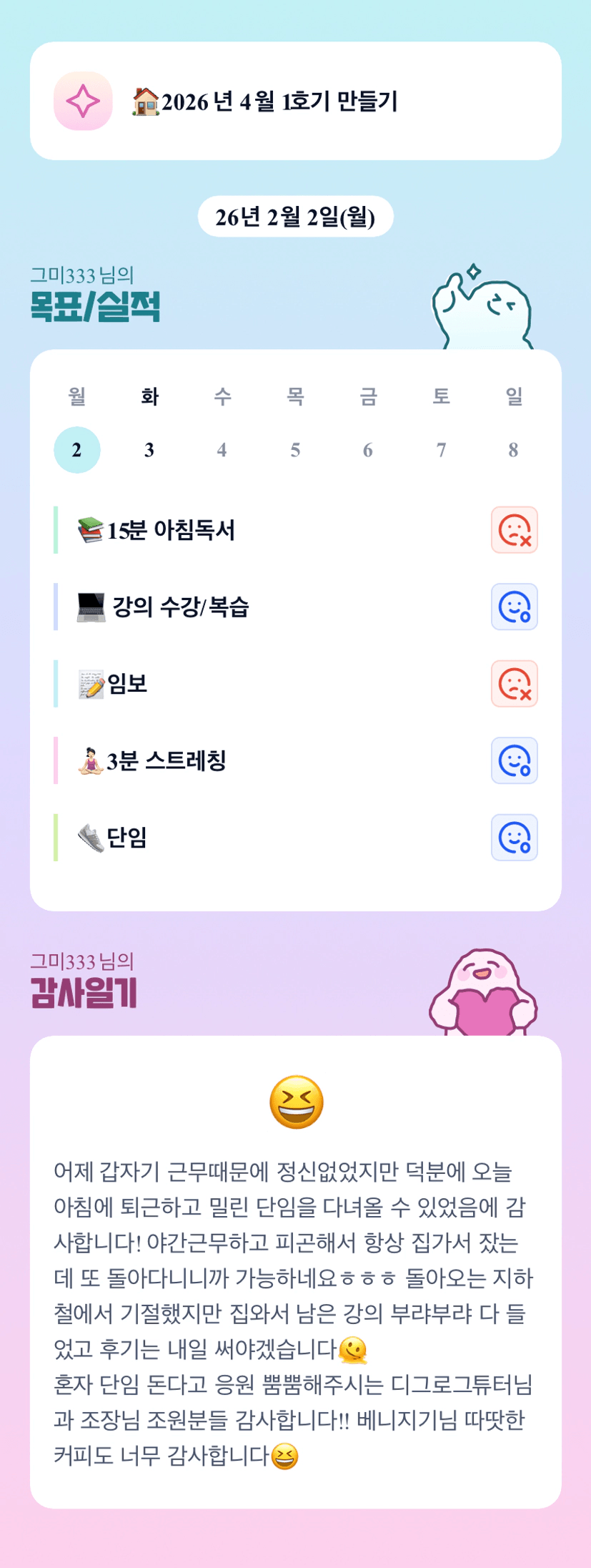 에고 그미님 아침에 퇴근 후 단임이라니ㅠㅠ거기다가 강의 완강이라니 ! 넘 멋지고 안쓰럽고 ㅠㅠ지하철에서 쪽잠이라도 주무셔서 다행입니다ㅠㅠ 건강 진짜 잘챙겨서 행복하게 해보아요~~~~~~!!!!오늘도 퐈이링!!>_<