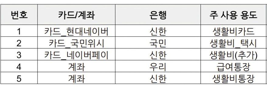 3단계. 자주 쓰는 계좌와 카드 리스트업하기 (최소 2개 ~ 최대 5개까지 진행하기)