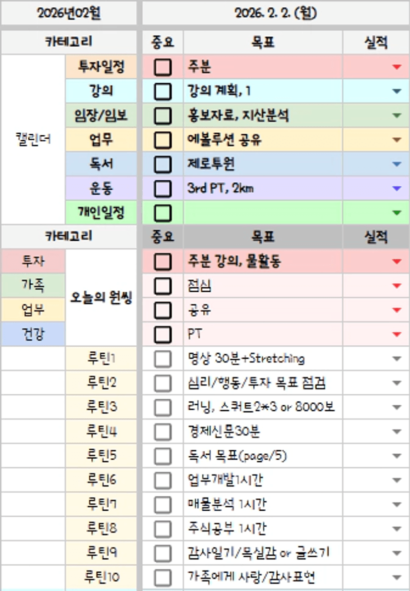 아침에 계획을 세우고 저녁에 복기를 합니다.