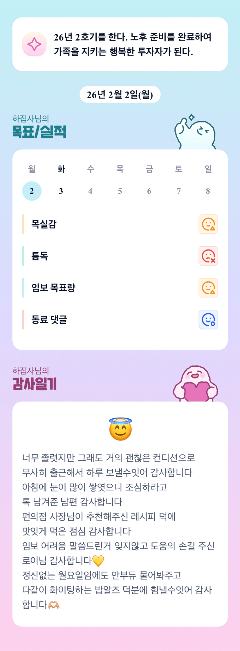 집사님 적응 다하시고 2월 돌입하신게 느껴지세요♡ ㅎㅎ 2월달 지방 앞마당 만들면서 또 함께 성장해용!!♡