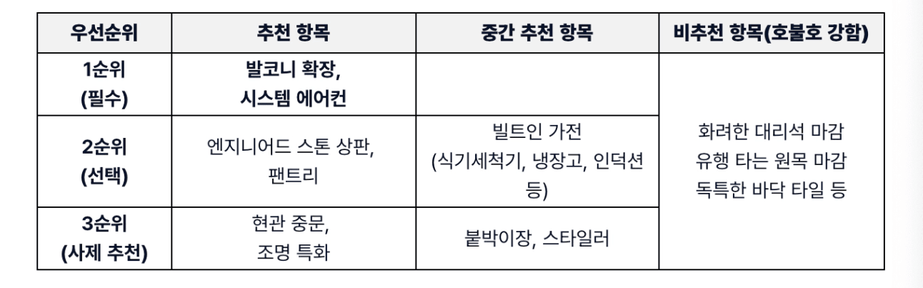 • 대표 항목 : 발코니 확장(필수), 시스템 에어컨(전실 설치 추천), 팬트리 수납 강화