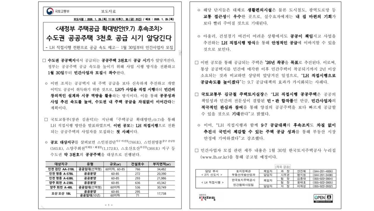 지난 1월29일, 정부의 주택공급 확대방안(9.7)에 대한 후속 조치로