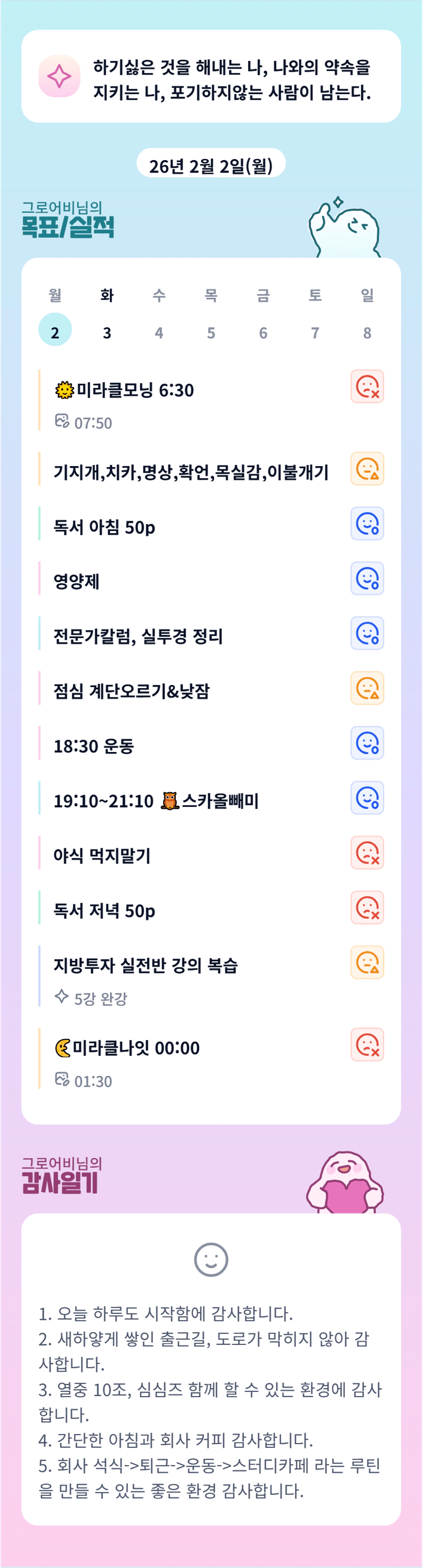 저도! 그로어비 조장님, 감사일기 보면서 조장님의 소소한 일상과 열정이 느껴집니다^^ㅎㅎ 꼭 다시 뵙고 싶네요 ㅎㅎㅎ 환경 안에 있으면 곧 뵙겠죠?!ㅎㅎ