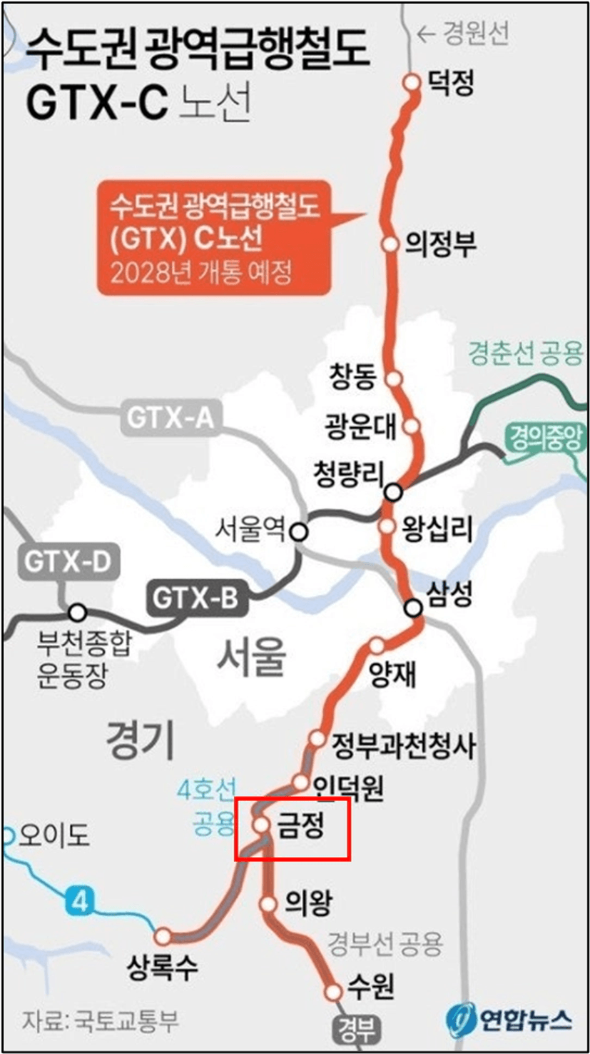 이 GTX-C 노선이 산본 신도시의 동북쪽에 위치한