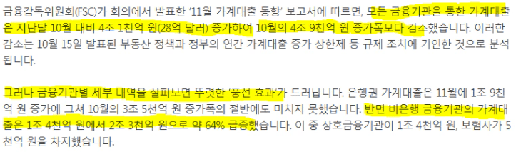 대출규제로 인한 가계대출은 상대적 느리게 증가 하고 있는 반면, 비은행권의 대출 수요는 늘고 있다라는 기사도