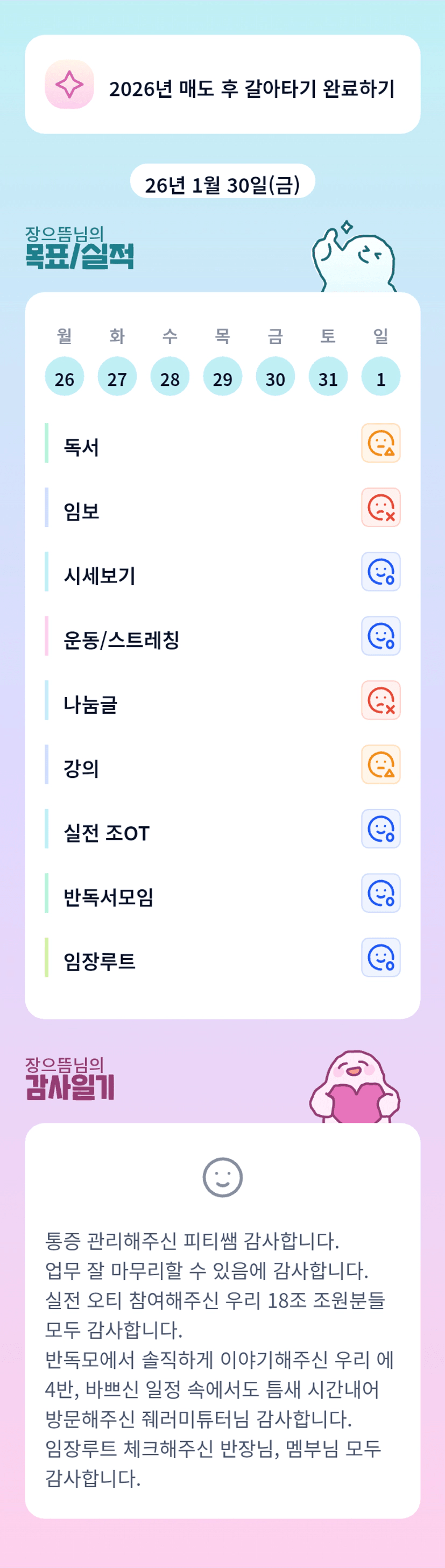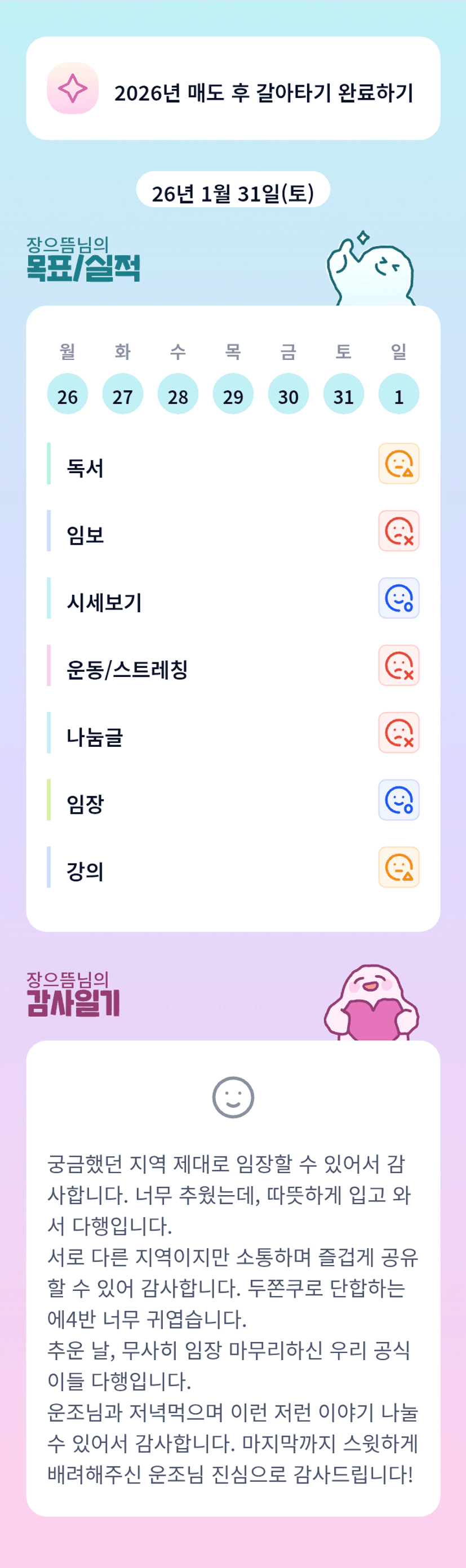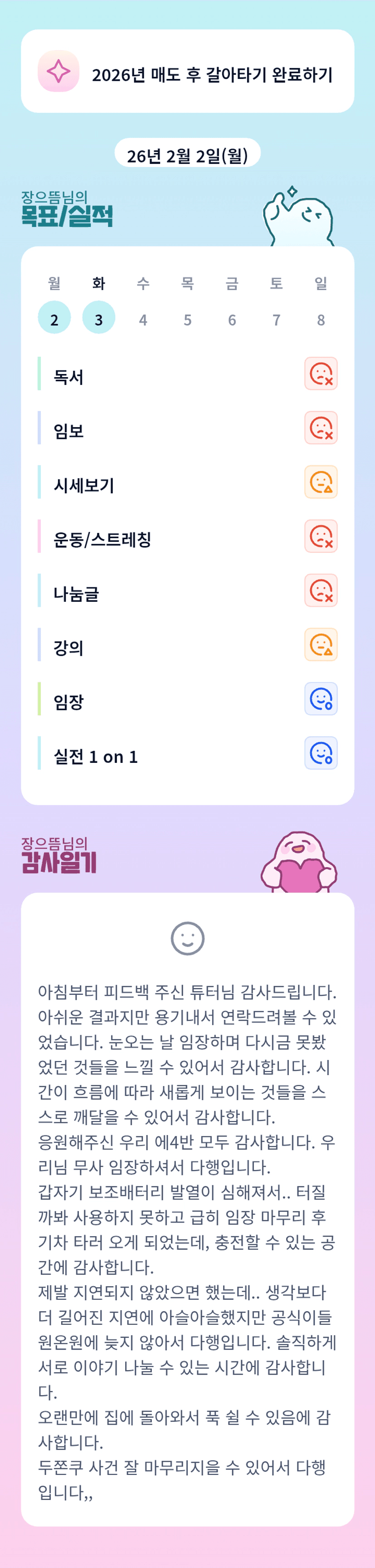 튜터님 임장을 길게 하셨군요~ㄷㄷ 원온원까지 정말 고생많으셨습니다. 감사해요 정말로🩷 공식이들도 열심히 따라가볼게요!!!