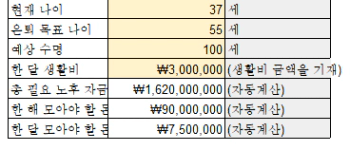 A. 총 필요 노후 자금: (3. 예상 수명 - 2. 은퇴 목표 나이) X 4. 한 달 생활비 X 12(개월)