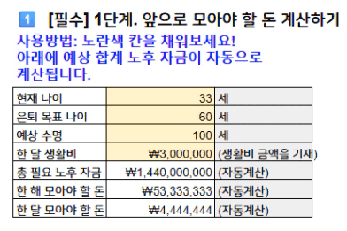 B. 한 해 모아야 할 돈: A. 총 필요 노후 자금 ÷ (2. 은퇴 목표 나이 - 1. 현재 나이)