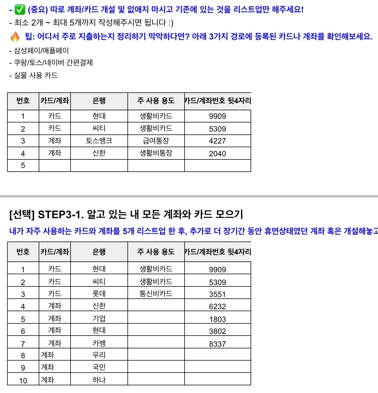 3단계. 자주 쓰는 계좌와 카드 리스트업하기 (최소 2개 ~ 최대 5개까지 진행하기)
