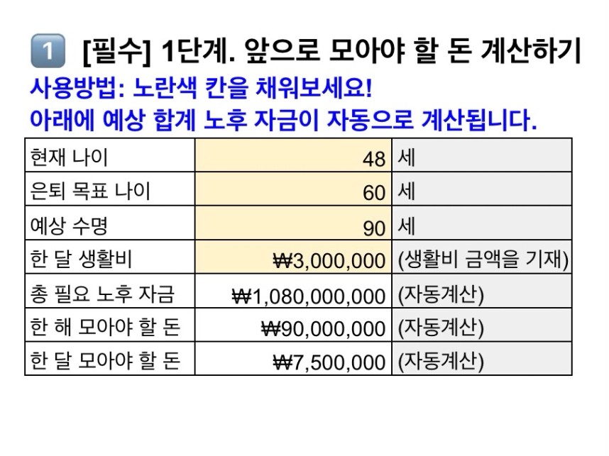 B. 한 해 모아야 할 돈: A. 총 필요 노후 자금 ÷ (2. 은퇴 목표 나이 - 1. 현재 나이)