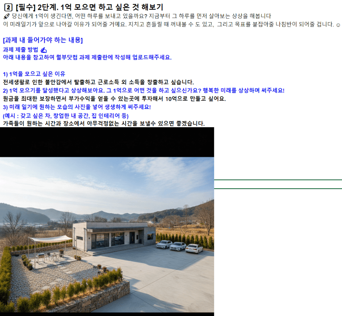 아직까지 무엇을 위해 돈을 벌어야 겠다는 생각을 깊게 해본적이 없엇는데, 미래일기를 작성하면서 어떠한 목표로 돈을 벌고 모으고 투자해야되는지에 대한 필요성을 생각하게 되었습니다.