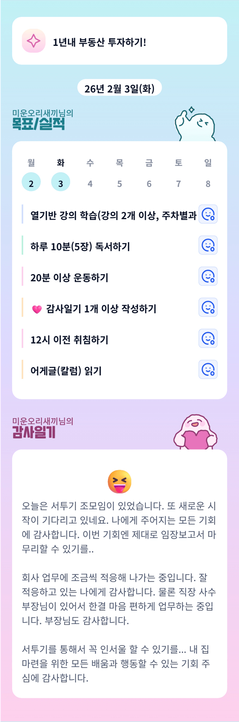 오리님~ 만나서 반갑습니다! 한 달간 화이팅해봐요!!