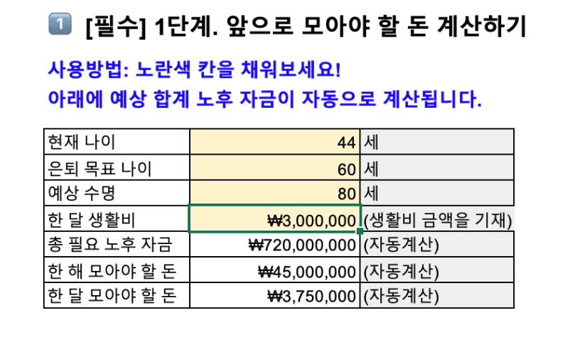 B. 한 해 모아야 할 돈: A. 총 필요 노후 자금 ÷ (2. 은퇴 목표 나이 - 1. 현재 나이)