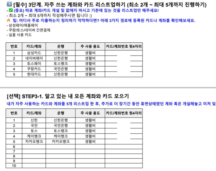 :흰색_확인_표시: (중요) 따로 계좌/카드 개설 및 없애지 마시고 기존에 있는 것을 리스트업만 해주세요!