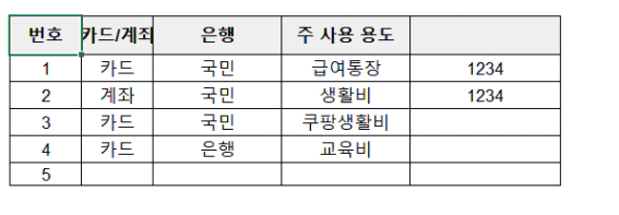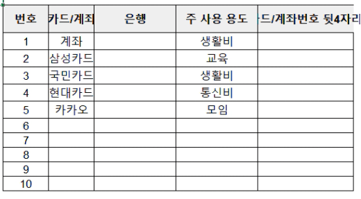 (중요) 따로 계좌/카드 개설 및 없애지 마시고 기존에 있는 것을 리스트업만 해주세요!