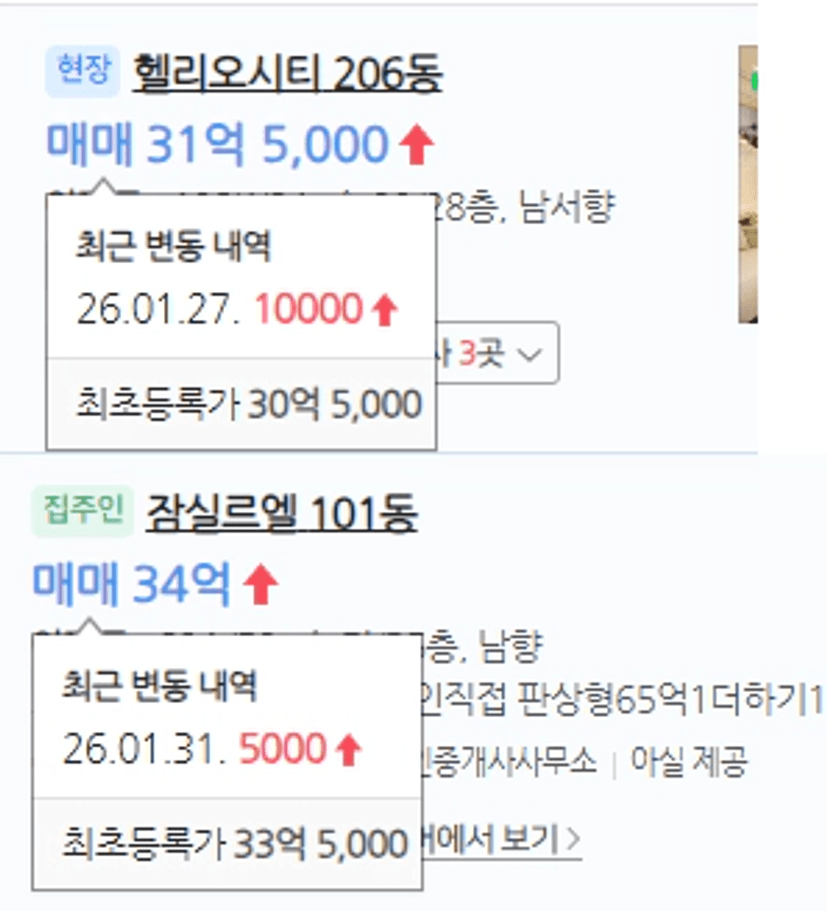 실제 호가를 보면 보합이거나 오히려 1억씩 오른 매물도 보입니다.