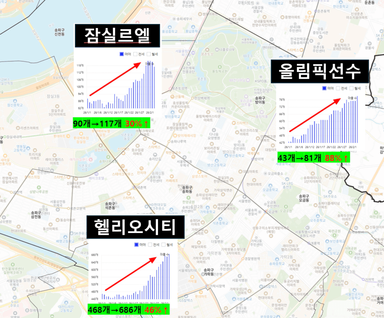 가락동, 방이동, 신천동의 증가세가 특히 뚜렷합니다.