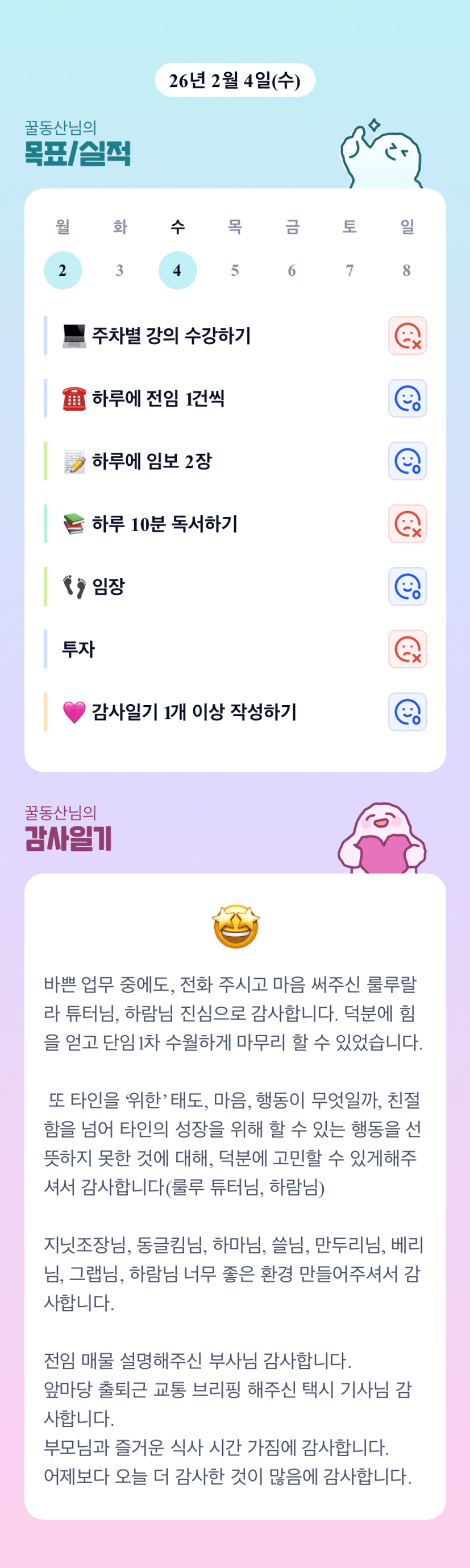 소소한 행동하나에도 감사의 의미를 붙여주시는 동산님께 더 감사한 하루네요 ㅠㅠ 혼자만의 외로운 시간 이겨내신 것 정말 축하드리고 고생 많으셨어요!!^^