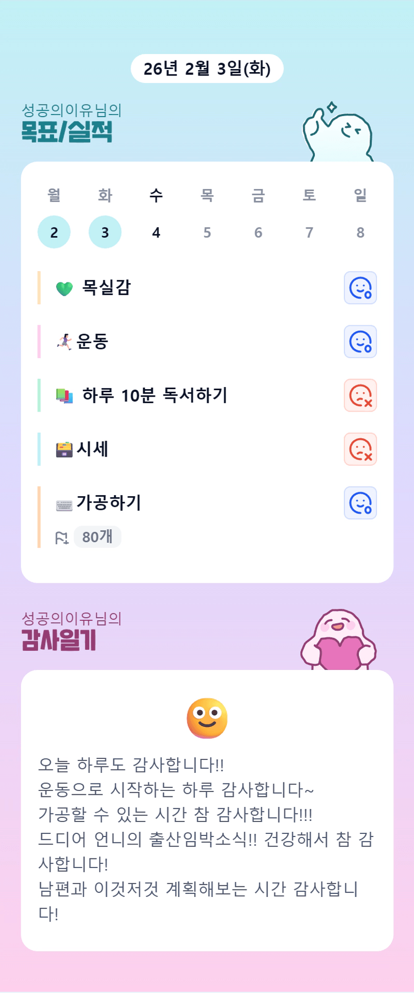 우리 성공님~~~ 행복한 감정이 여기까지 느껴져요ㅎㅎㅎ 운동하고 가공하고 가족의 행복한 소식 남편과 함께하는 시간 정말 소중하고 평범하고 감사한 하루네요~~ 오늘도 날씨가 추운데 건강 유의하시면서 행복한 하루 만들어 가셔요~! 화이팅!♥