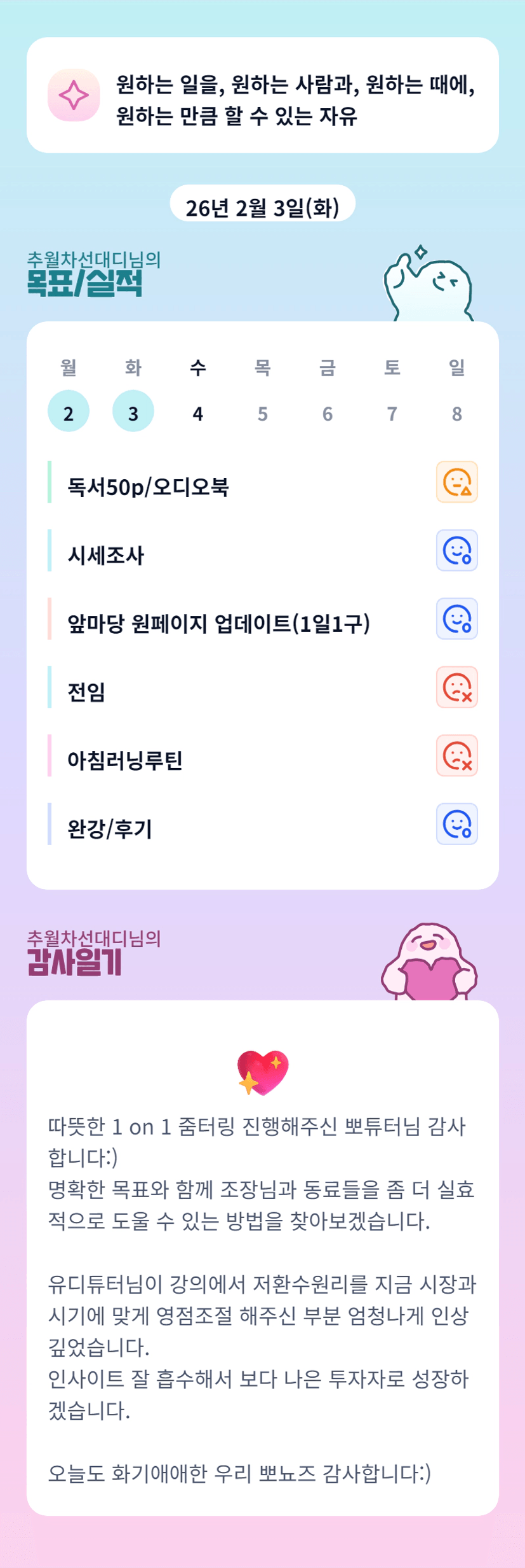 앞마당 원페이지 1일 1구 목표 달성을 축하드려요!! 우리 조원의 대디로써 지금보다 한 발짝 더 앞으로 나아가면서 조원들을 성장하는데 힘써주시는 추디님 존경해요.!! 많이 배우겠습니다.
