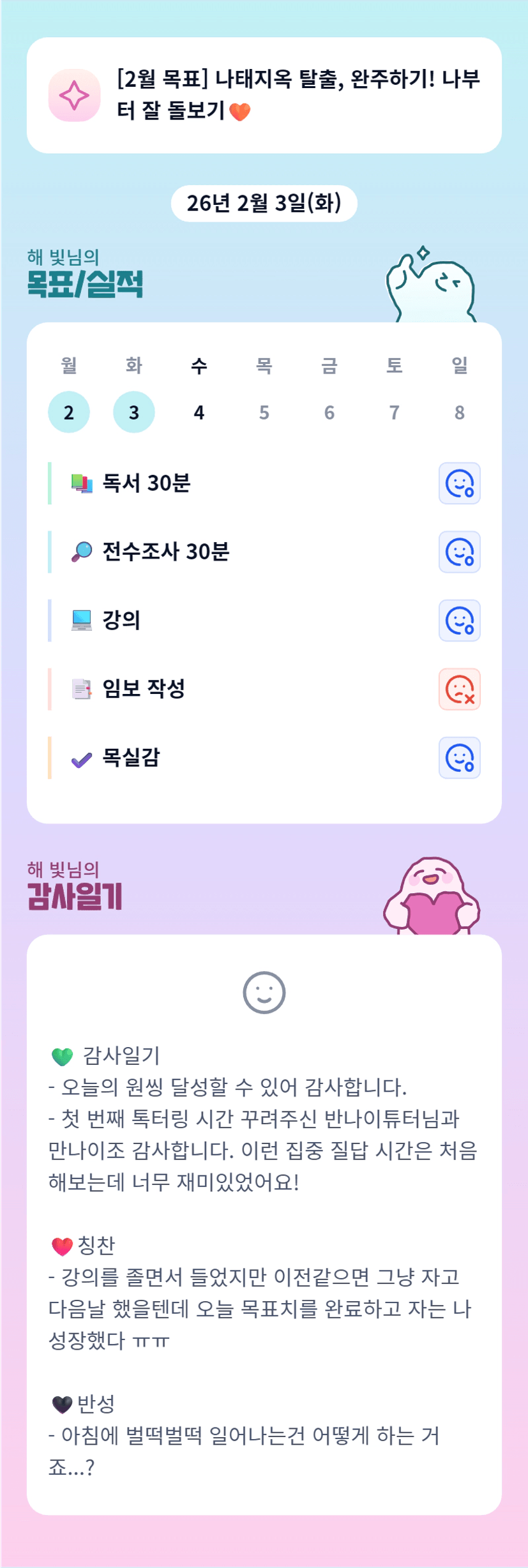 크 졸려도 목표치까지 다 하고 잠든 해 빛님 넘넘 고생하셨습니다!! 정말 멋지세요! 👍 👍 👍 저도 아침에 바로 눈뜨는거 배우고 싶습니다 ㅎㅎ