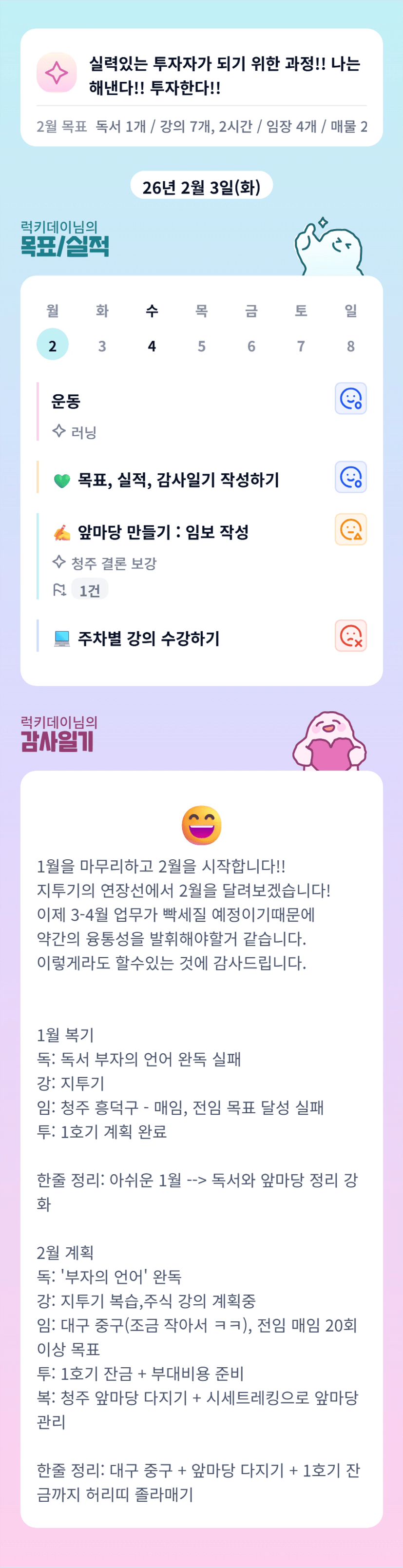 럭키님 안주무신건가요?일어나신건가요?ㅎㅎ 1월한달 고생많으셨습니다.2월도 건강챙기며 화이팅입니다 ❤️