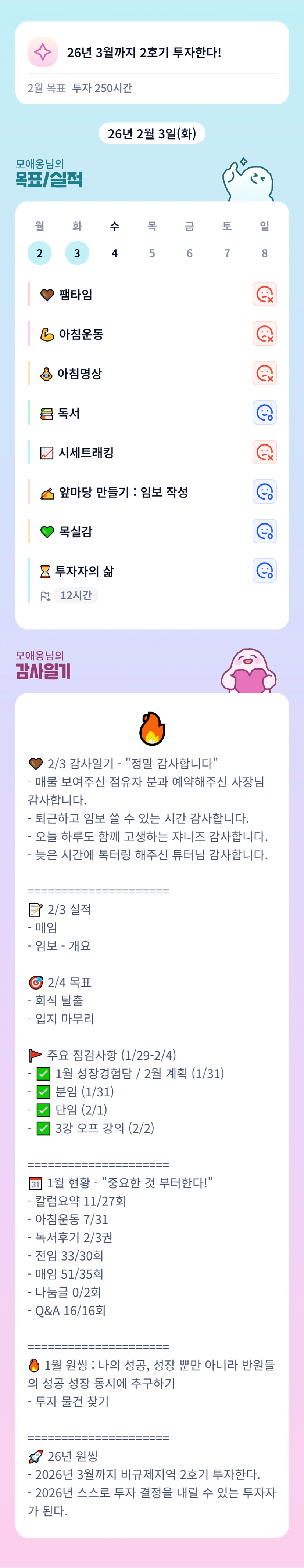 모애용님 어제 하루도 수고하셨어요~! 이번달 꼭 투자물건 찾으실 수 있길 응원드릴게요!!😊
