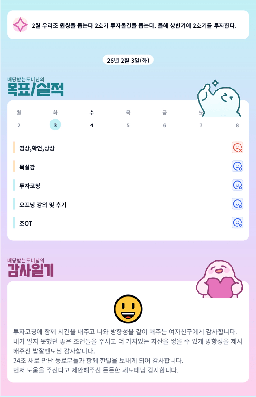 도비님~ 투코 받으셨군요~! 코칭 잘 받으셔서 더 가치있는 자산 쌓을 수 있는 좋은 방향 잡아가셨으면 좋겠어요😊 함께해주시고 지지해주시는 여자친구분도 넘 멋지시네요!^^ 2월도 화이팅이예요~!