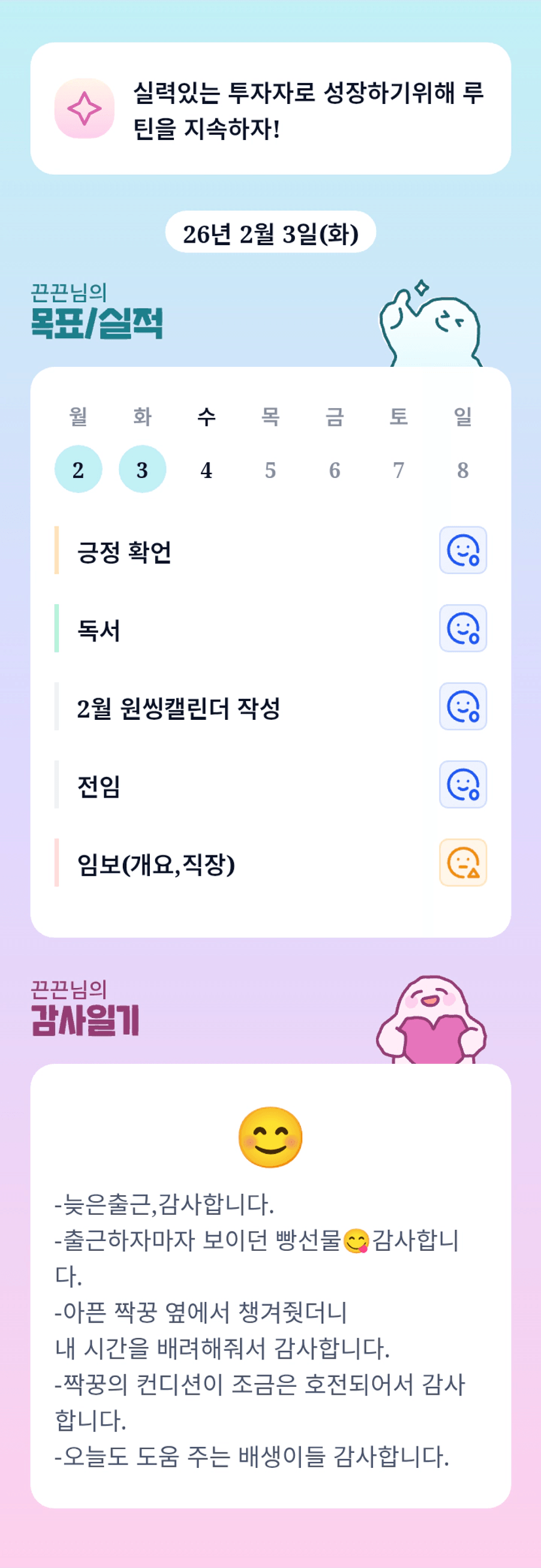 끈끈님~ 우리 또 함께하다니 넘 신기하고 좋아요!!! 이번달 함께 화이팅해요!! 우리 내일 만나요오~~ ^^