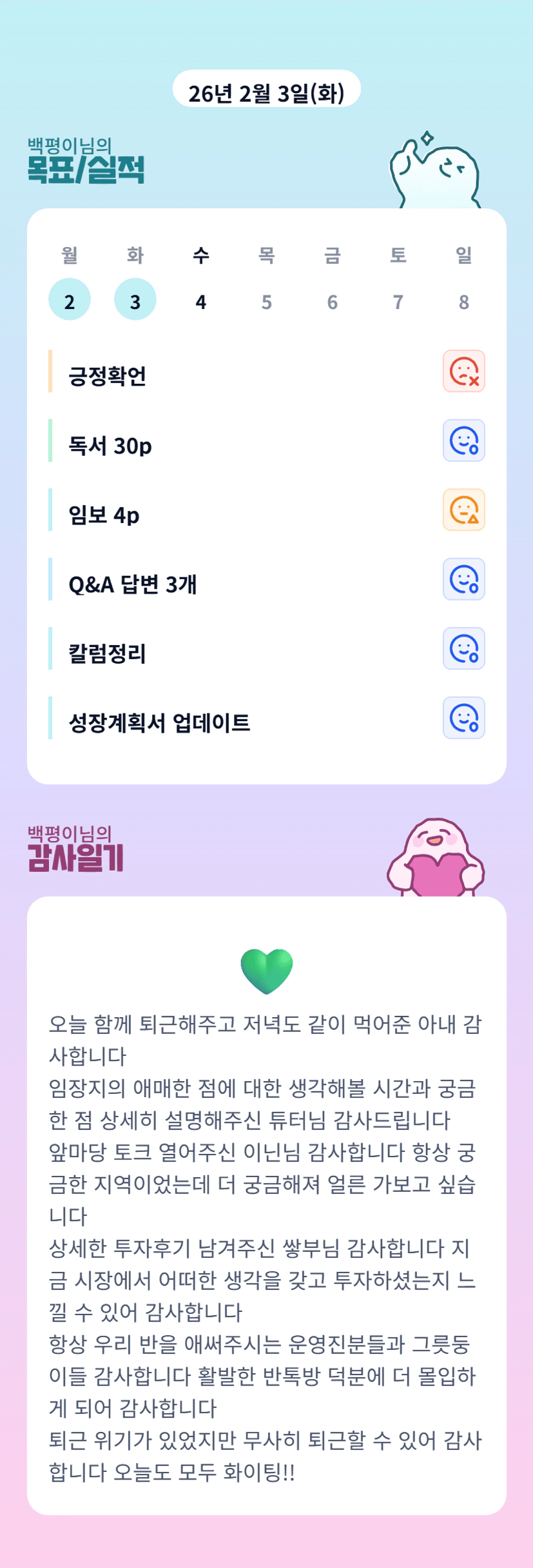ㅎㅎ 성실한 평이님 덕분에 우리반이 더욱 시너지 효과가 나는 것 같아요 :) 정말 감사드려요!!💛