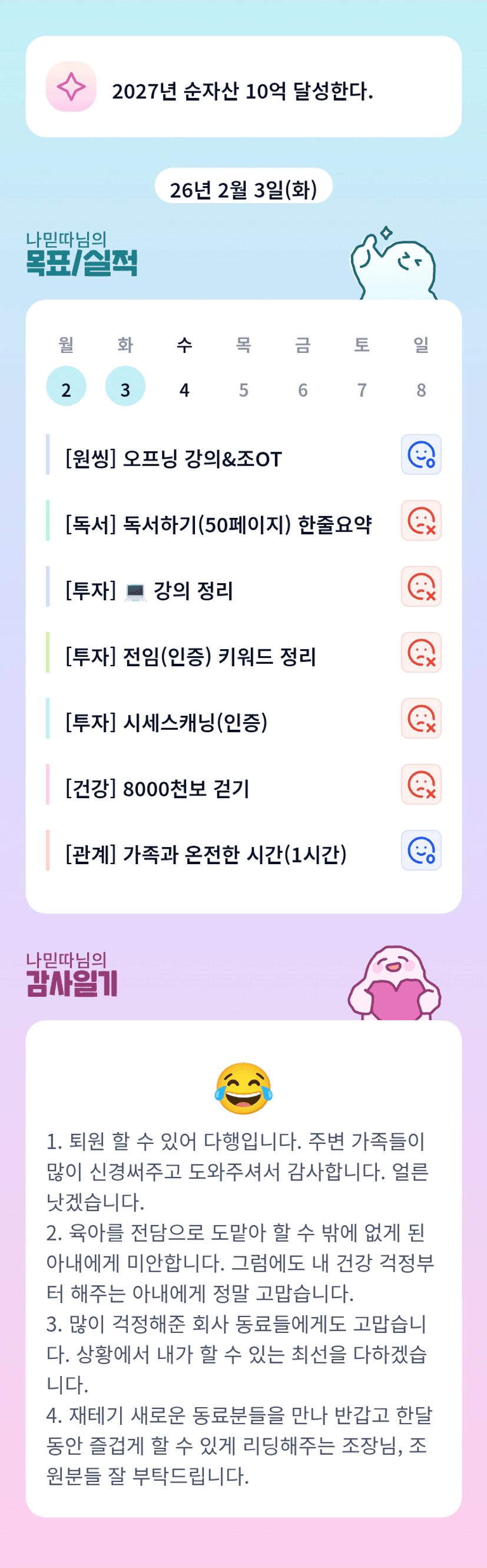 엇 조장님 입원까지하셨던거에여?? ㅠㅠㅠ 너무 애쓰셨습니당 ㅠㅠ 퇴원축하드려용!! 2월 한달은 건강 챙겨가시면서 고고 해주세용!!