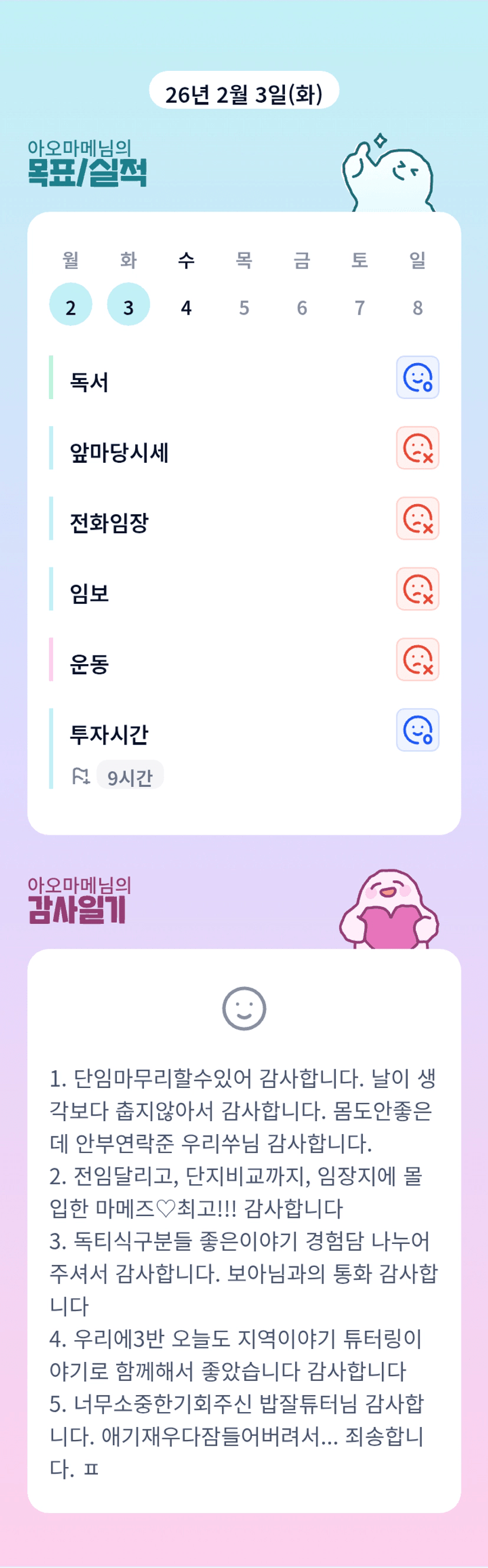 많이 피곤하셨던 튜터님ㅠ 몸 건강챙기시면서 소중한 기회 화이팅입니당!!🩷💛