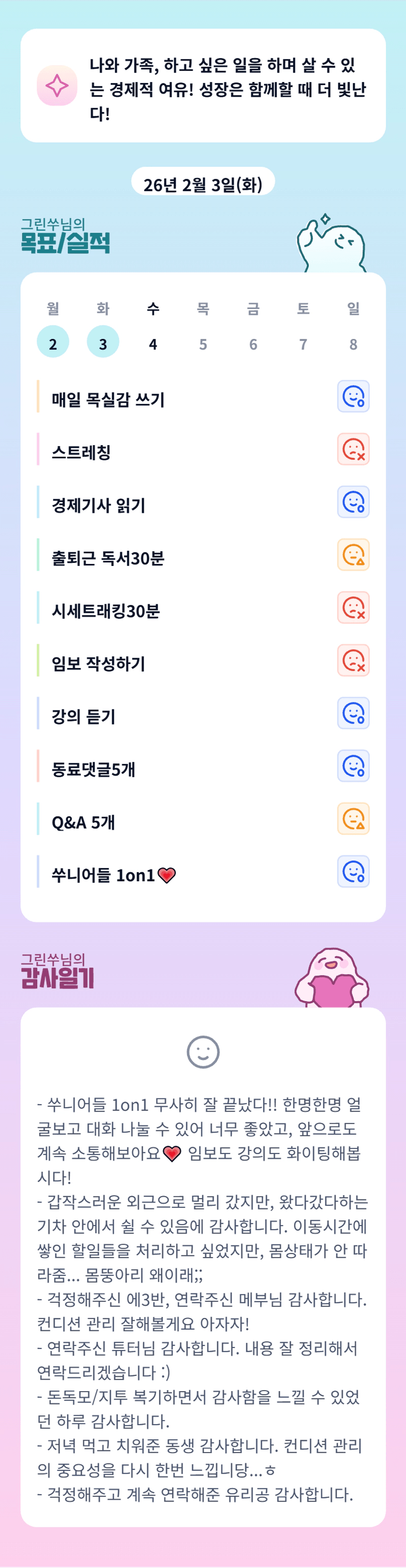 튜터님 감기 걸린 거 아니시지요?? ㅠㅠ 몸 안 좋으시면 바로바로 약 챙겨드세요~!! 세심하게 1on1 해주셔서 감사합니다💜