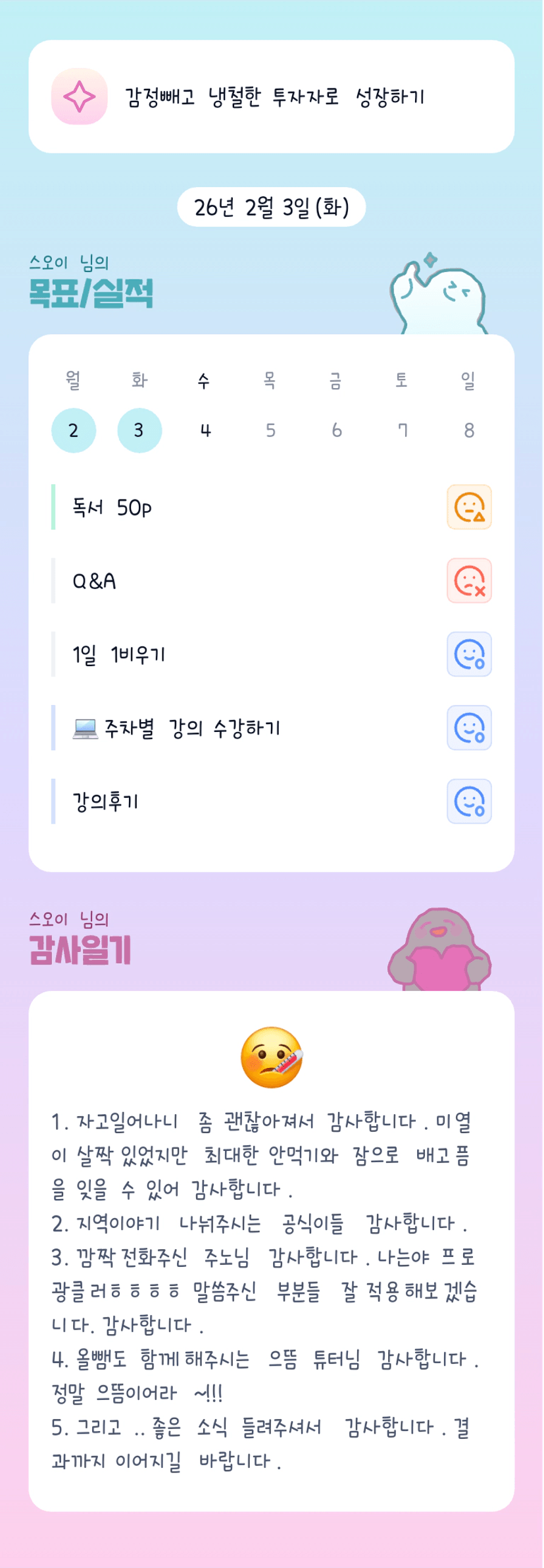 아공;; 병원 다니시던데 아직도 안 좋으시죠?? ㅠ 조장님 건강 챙기신 후에 저희조 챙겨주세요^^ 담주엔 쌩쌩한 얼굴이시길요!