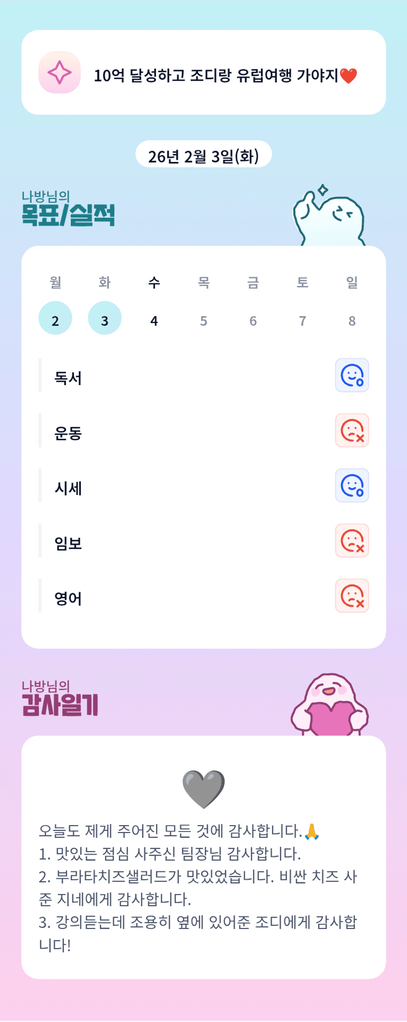 조디님과 유럽여행가기 목표 곧 이루겠는디유?!?!ㅎㅎㅎㅎ 목실감 누르자마자 뭔가 기분좋아지는 문구였다~~~