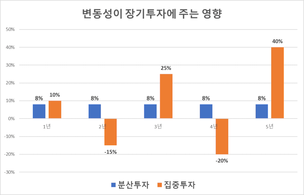 매년 8% 꾸준히 수익을 내는 포트폴리오가 집중투자로 변동성 높은 포트보다, 누적 복리 수익률이 50%가 더 높았습니다. 장기로 갈수록 변동성이 클수록 복리수익률이 하락합니다.
