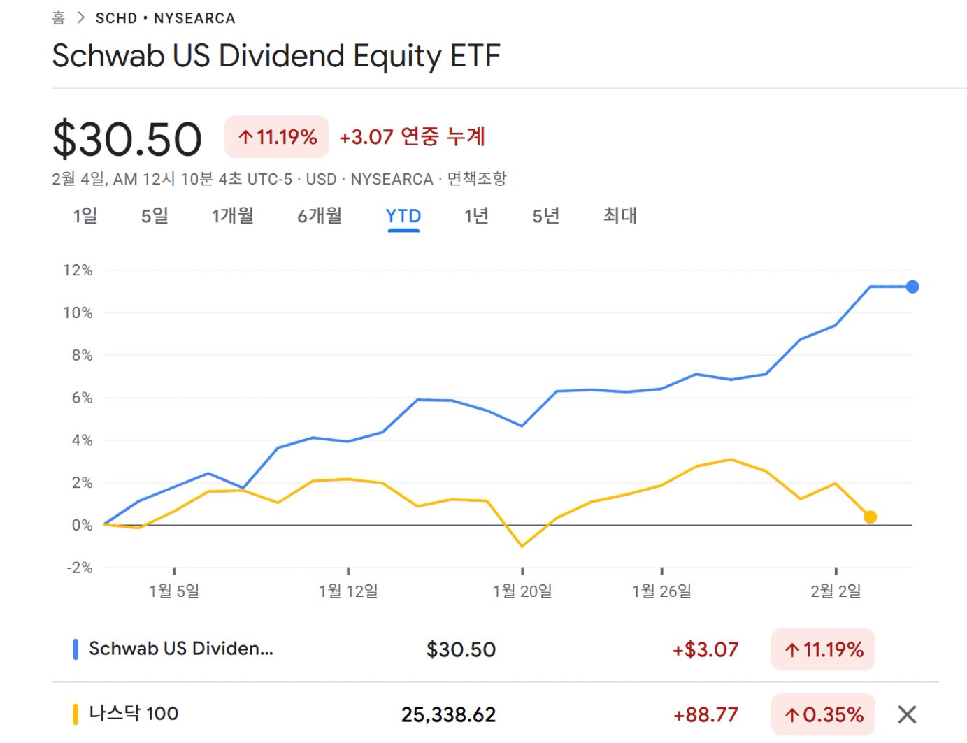 SCHD는 미국 가치주에 투자하는 배당성장주인데, 24-25년 연속된 리밸런싱 문제로 주가가 지지부진했습니다. 그러나 26년 들어서 YTD(26.1.1-현재) 기준 11.2% 상승, 나스닥100은 0.35% 상승에 그치고 있습니다.