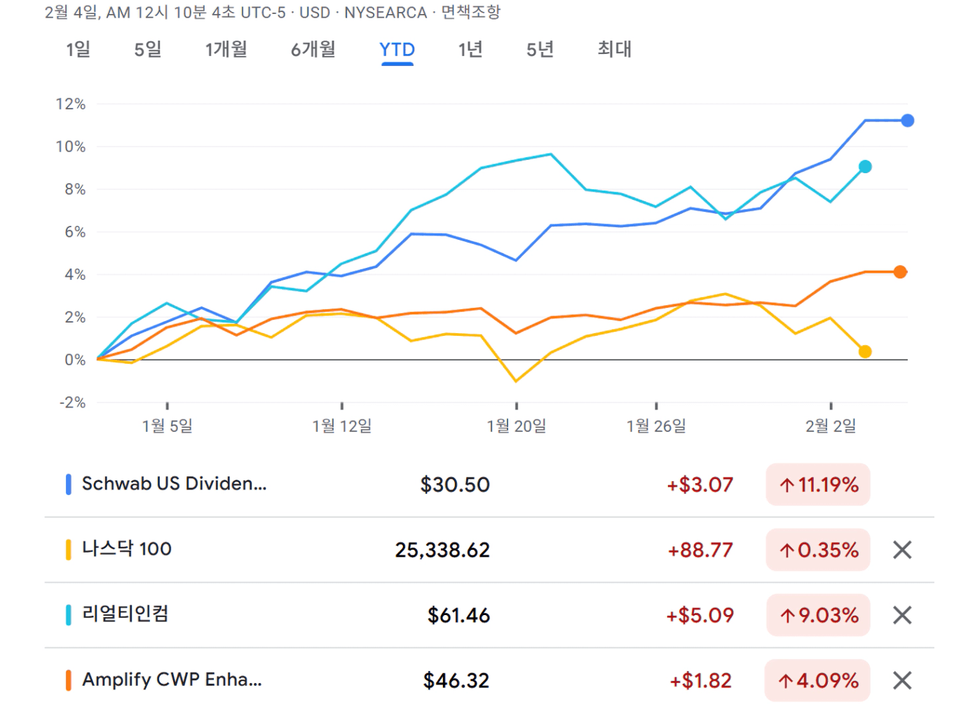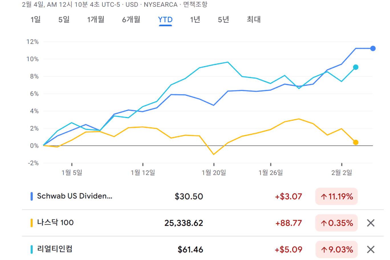 나스닥 100이 엔비디아, 애플, 마이크로소프트 등 대형성장주가 하락 횡보하고, 소프트웨어 관련 주식이 추풍낙엽처럼 떨어지면서, 나스닥100 역시 26년 들어 헤메고 있을때, 조롱받던 SCHD가 벌써 11% 이상 상승 중