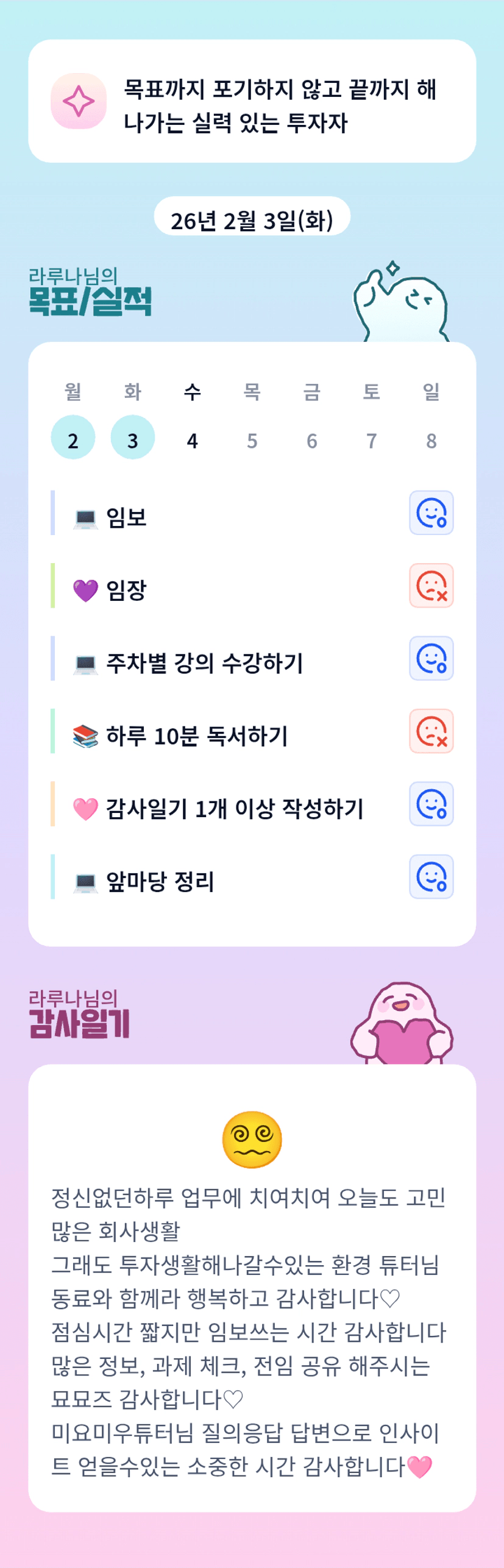짧은 점심시간에도 임보쓰기 ㅠㅠ 넘 대단하십니다.. 항상 응원 많이 보내주시는 루나님... 긍정에너지 많이 보내주셔서 감사합니다. 오늘도 수고하셨습니다^^