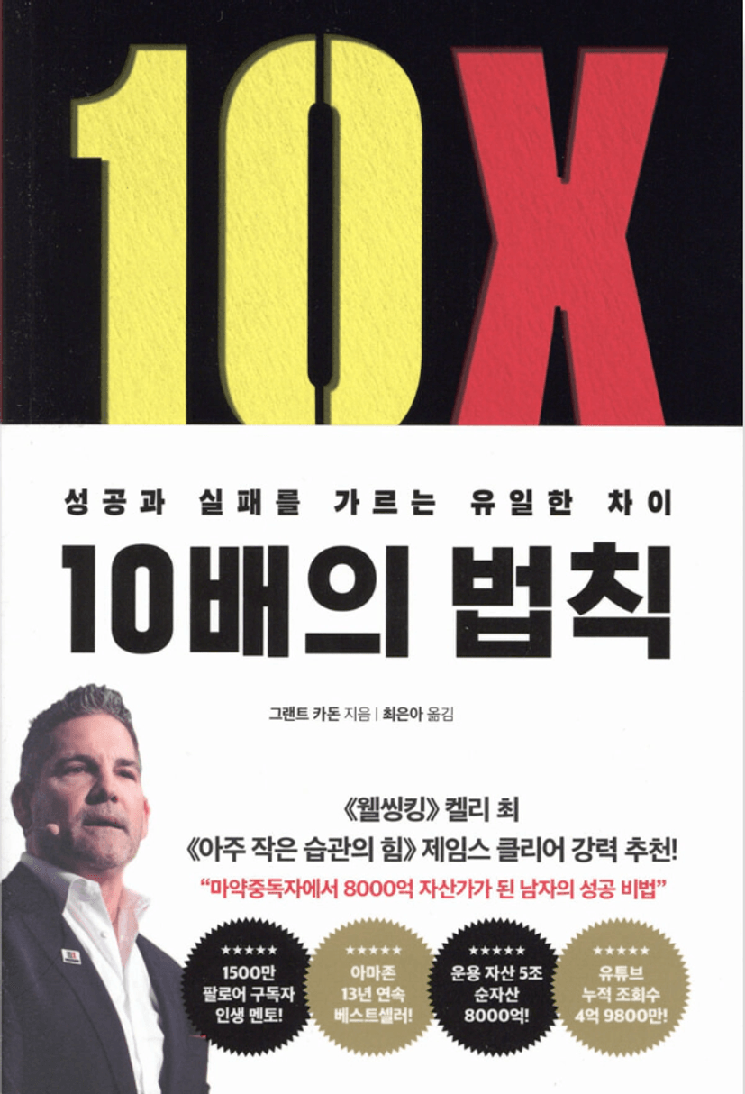 《10배의 법칙》은 마약중독과 개인 파산을 극복하고 4000억 자산가가 된 그랜트 카돈의 성공 비법을 담은 책입니다. 핵심 메시지는 “목표를 10배 더 크게 설정하고, 행동을 10배 더 많이 하라”는 것입니다.저자는 보통 수준의 평범한 행동이나 사고로는 절대 성공할 수 없다고 강조합니다. 보통은 실패로 가는 공식일 뿐입니다. 성공한 사람들은 언제나 예외 없이 10배 더 엄청나게 행동하고 10배 더 원대하게 생각합니다. 10배 더 큰 목표를 세우고, 미친 듯이 집착하고, 올인하고, 끝없이 확장합니다.