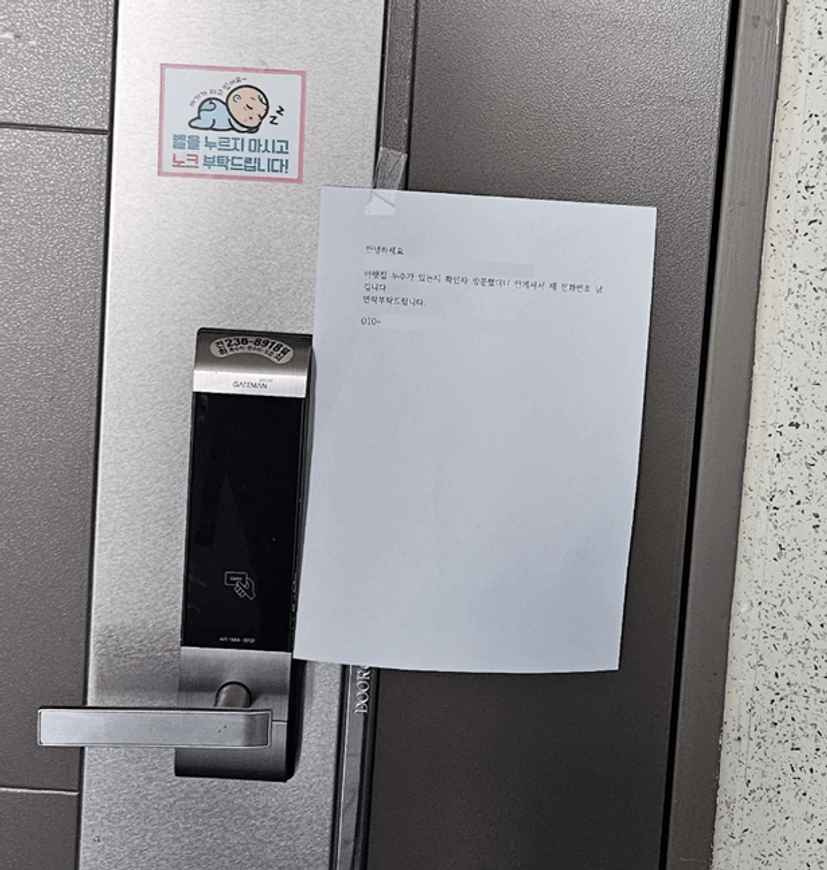 만약 아랫 집이 부재 중이시거나 당장 집을 보여주시기 어렵다고 하실 때에는 메모에 연락처를 남겨서 확인 후 회신을 부탁 드렸던 것 같습니다. 혹시나 따로 메모지를 챙겨가지 못했다면 부동산 사장님께 따로 부탁 드리면 메모를 붙여주시기도 합니다.