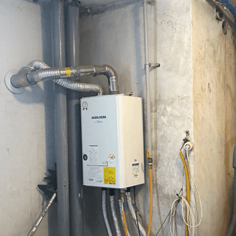보일러 아래쪽으로 연결된 여러 배관들 사이에서 물이 한 방울씩 맺히는지, 바닥에 하얀 석회 가루가 쌓여 있는지 보세요. 보일러 자체 결함일 수도 있지만 배관 연결 부위 문제일 때가 많습니다.