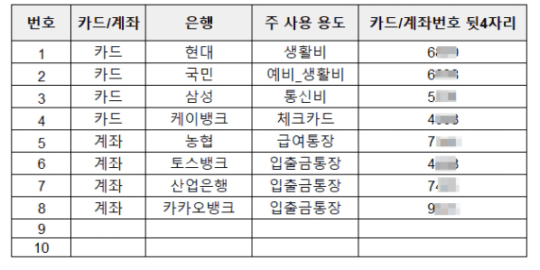 (중요) 따로 계좌/카드 개설 및 없애지 마시고 기존에 있는 것을 리스트업만 해주세요!