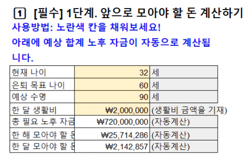 B. 한 해 모아야 할 돈: A. 총 필요 노후 자금 ÷ (2. 은퇴 목표 나이 - 1. 현재 나이)