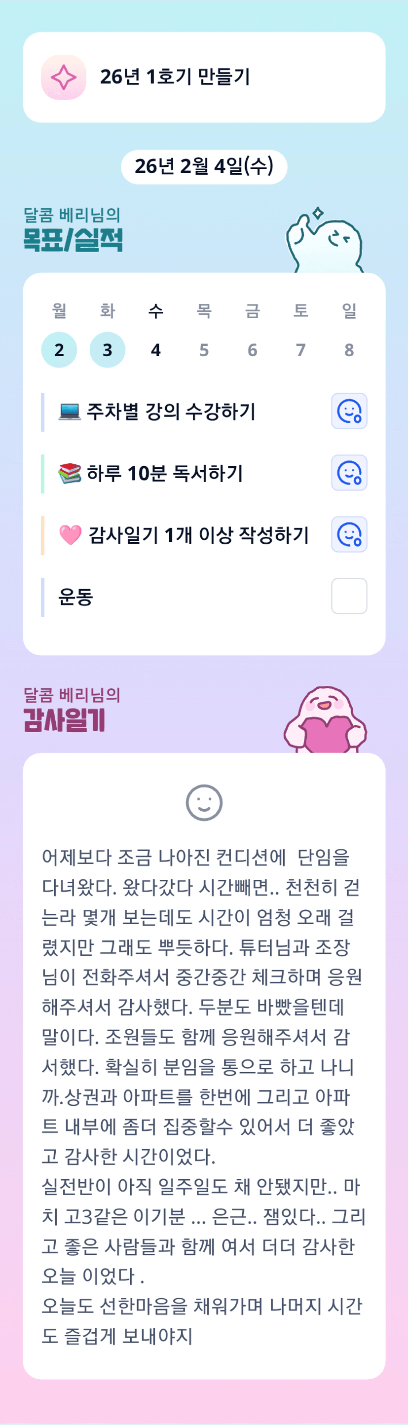 베리님의 한발한발이 참 소중하고 힘이 됩니다. 너무 잘하고 계세요!!