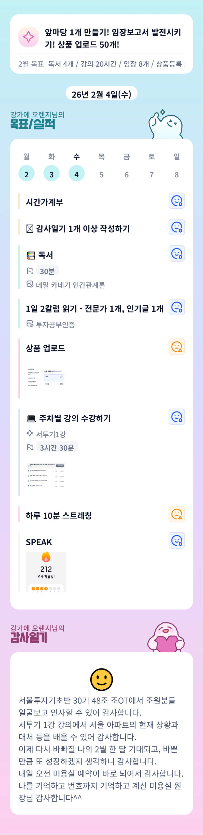 우왕 강가님 목실감 꾸준하시네요! 대단하세요 ㅎㅎ 오늘도 고생 많으셨습니다~~